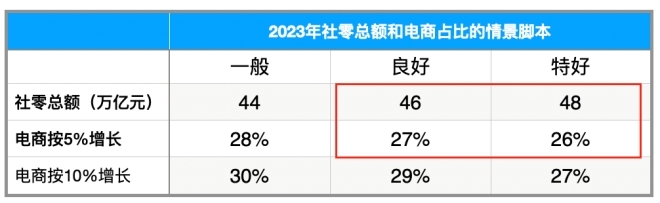 如果用12.5萬(wàn)億元除以預(yù)測(cè)的社零總額46萬(wàn)億元,則2023年預(yù)計(jì)的電商占比是27.2%,與2022年持平。如果社零總額達(dá)到48萬(wàn)億元,則電商占比將降至26.0%。所以2023年最終的電商占比,取決于社零總額的走勢(shì),如果社零總額低,則電商占比較高;如果社零總額高,則電商占比較低。范圍就在26%~27%附近變動(dòng)。為此,筆者繪制了一個(gè)2023年社零總額和電商占比情景腳本,如表1所示。