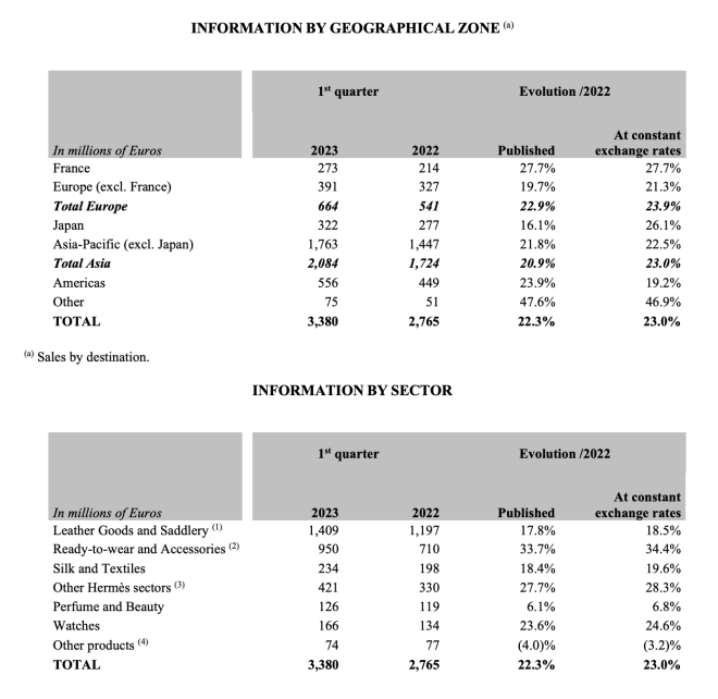 2023年第一季度,愛馬仕(Hermès)報告綜合收入同比增長23%,達(dá)到約37億美元(33.8億歐元),各業(yè)務(wù)線和地理區(qū)域的銷售額均有所增加,其中亞地區(qū)銷售額增長了23%。