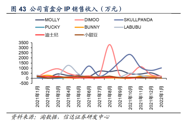 從信達(dá)證券研發(fā)中心的數(shù)據(jù)可以看出,泡泡瑪特內(nèi)部的設(shè)計人員兩年翻了一倍。成果上內(nèi)部設(shè)計師團(tuán)隊在2020年推出IP小甜豆,2021年推出IP小野,2020年推出小小的使壞系列等。
