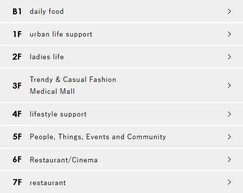 從剖面圖不難看出,與諸多日本項(xiàng)目類似,這是一個(gè)縱向布局的購(gòu)物中心,地下4層、地上6層。其高區(qū)的空間利用和業(yè)態(tài)選擇,有不少有趣的地方。