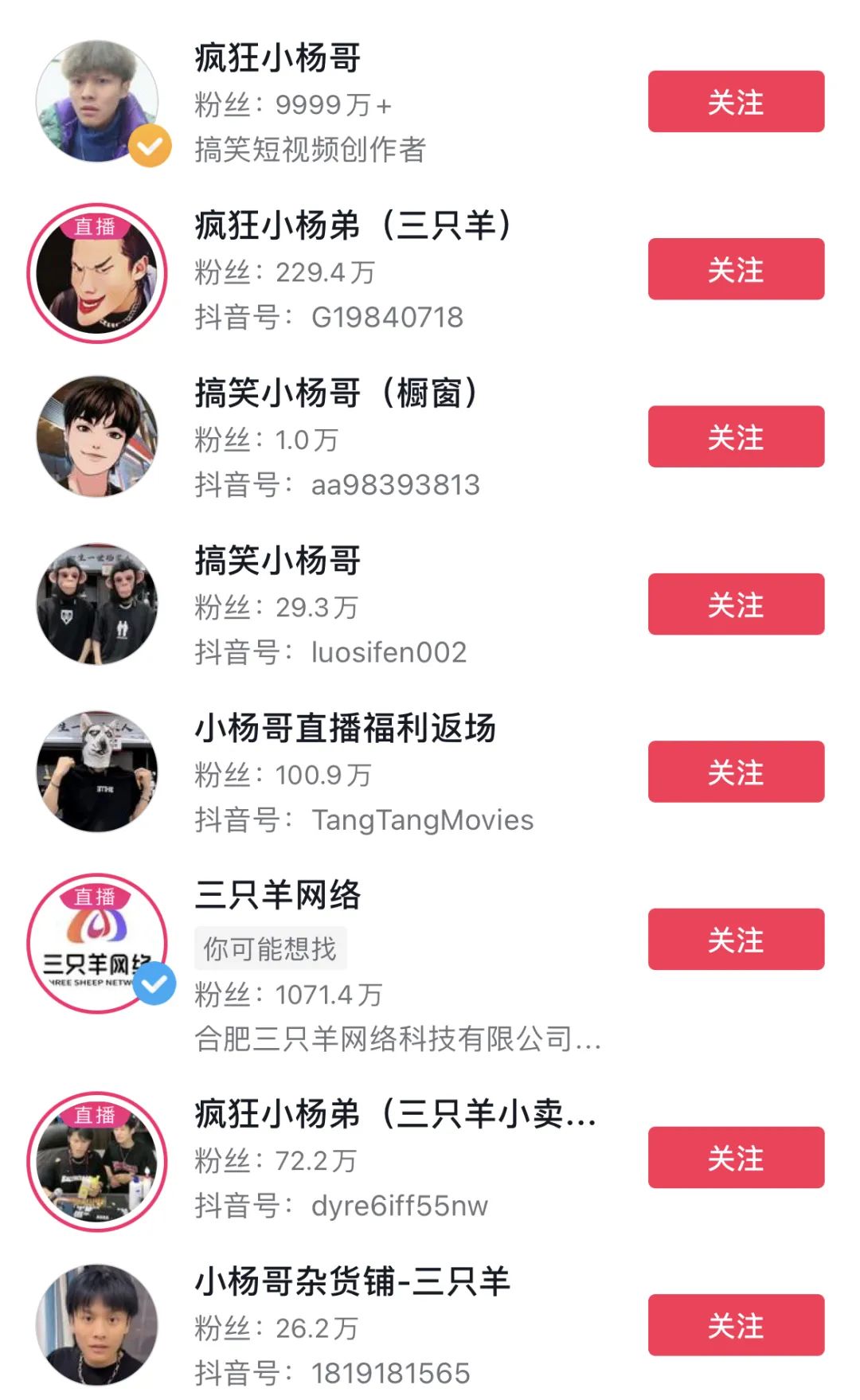 而在小楊哥的有意布局之下,成百上千個小楊哥正在瘋狂出現(xiàn),比如“搞笑小楊哥”“瘋狂小小楊”“瘋狂小楊弟”……去年年底,新榜數(shù)據(jù)曾經(jīng)做過一次統(tǒng)計,“三只羊”擁有300多個已授權(quán)賬號,還有近千個在待審核階段。