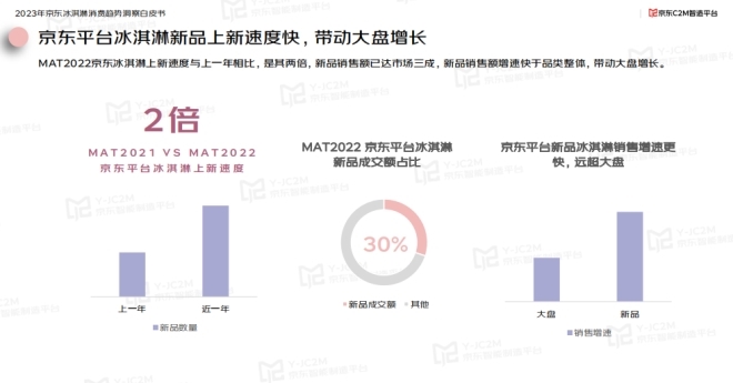 出于京東超市對消費者需求的精準(zhǔn)把握,京東超市冰淇淋品類新品銷售表現(xiàn)亮眼,2022年京東冰淇淋上新速度是2021年的2倍,且新品銷售增速遠超大盤,帶動行業(yè)增長。