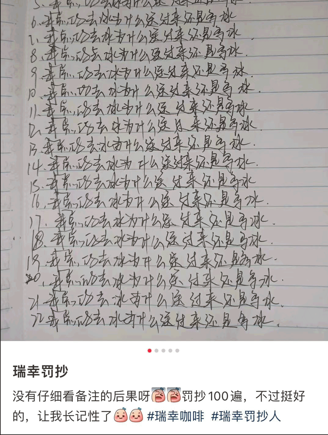 作業(yè)本、手寫字、重復(fù)N遍的語(yǔ)句,你以為是小學(xué)作業(yè)嗎?不,這是瑞幸員工的“罰抄”。