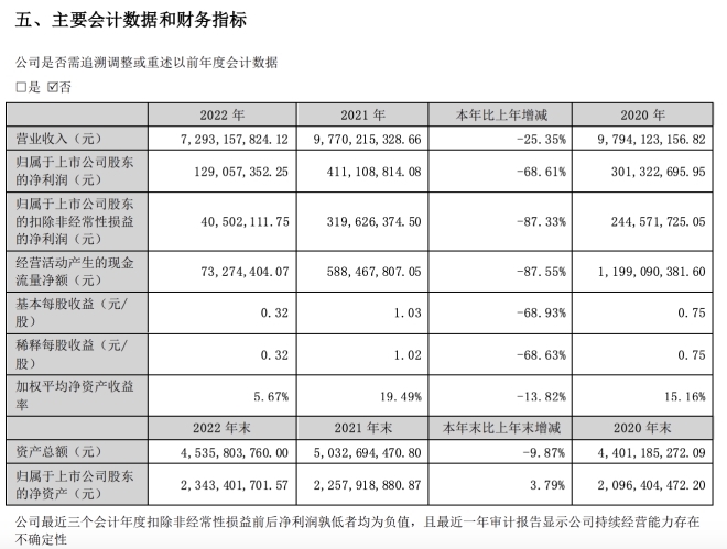 2022年,三只松鼠實(shí)現(xiàn)營收72.93億元,同比下降25.35%;歸屬于上市公司股東的凈利潤1.29億元,同比下降68.61%;經(jīng)營活動(dòng)產(chǎn)生的現(xiàn)金流量凈額7327萬元,同比下降87.55%;基本每股收益0.32元,同比下降68.93%。