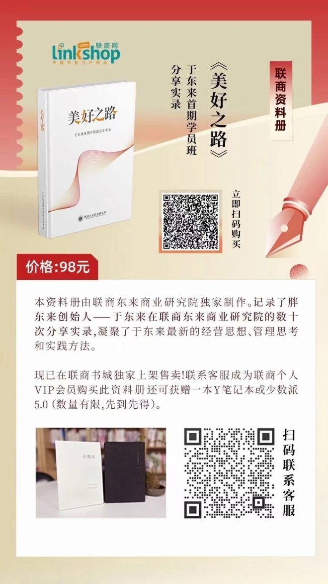 今年,聯(lián)商東來商業(yè)研究院獨(dú)家制作并推出《美好之路》,該資料冊共分為5個(gè)篇章,分別為“文化篇”、“管理篇”、“業(yè)務(wù)篇”、“分享篇”以及“現(xiàn)場篇”。記錄了于東來在聯(lián)商東來商業(yè)研究院的數(shù)十次分享實(shí)錄,凝聚了于東來最新的經(jīng)營思想、管理思考和實(shí)踐方法,F(xiàn)已在聯(lián)商書城獨(dú)家上架售賣!點(diǎn)擊鏈接或者掃描海報(bào)中二維碼即可立即購買。