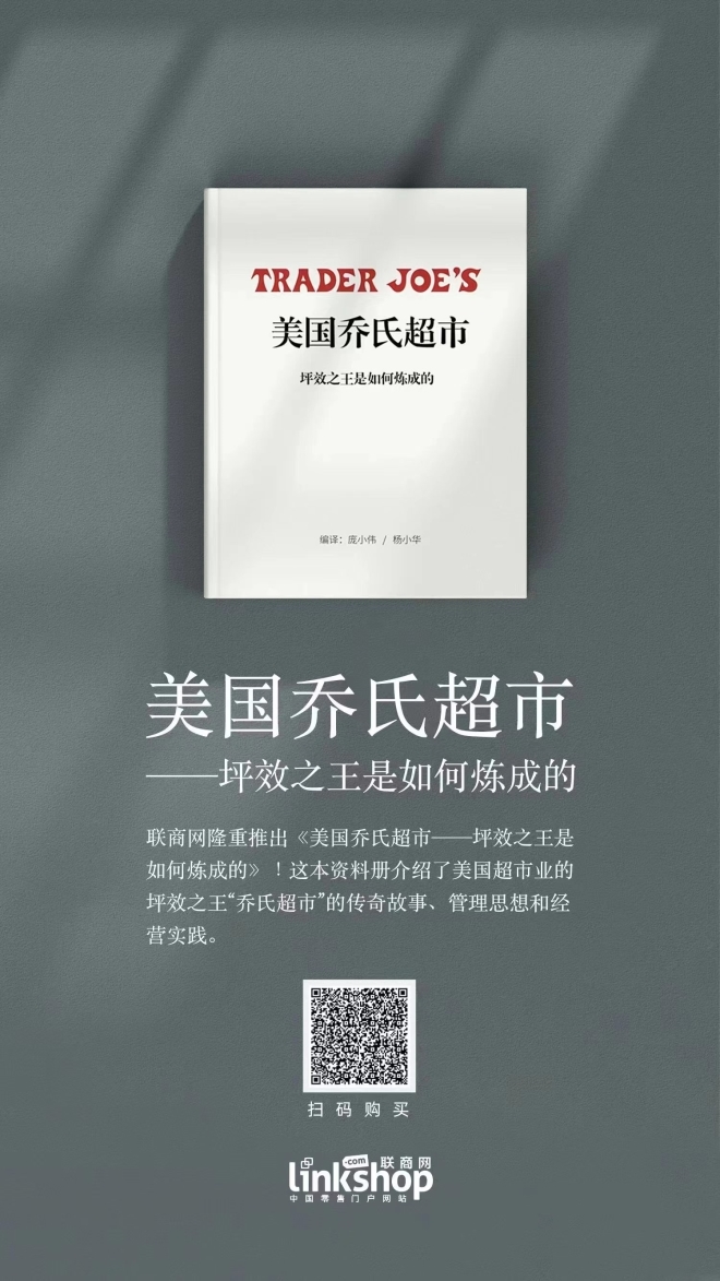 聯(lián)商網(wǎng)隆重推出《美國喬氏超市:坪效之王是如何煉成的》。本資料冊由聯(lián)商網(wǎng)董事長龐小偉和“自有品牌”公眾號主編楊小華聯(lián)合編譯,介紹了美國超市業(yè)的坪效之王“喬氏超市(Trader Joe’s)”的傳奇故事、管理思想和經(jīng)營實踐。是業(yè)內(nèi)目前關于喬氏超市最新、最為詳盡全面的研究資料,已在聯(lián)商書城獨家上架!