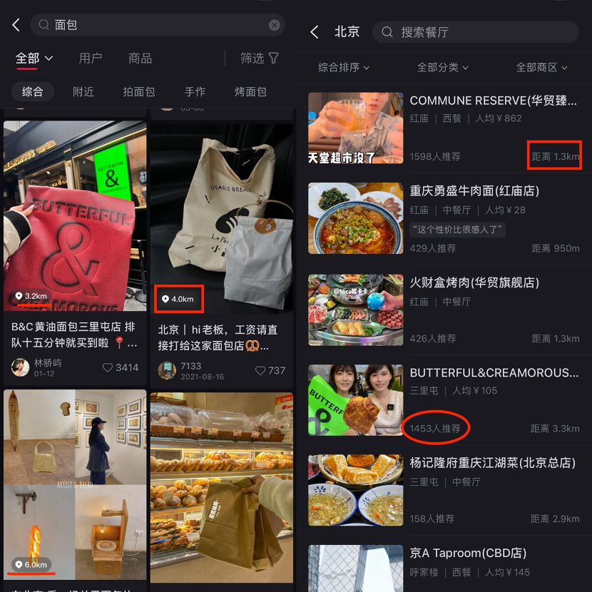 用戶在小紅書搜索類似「面包」「西餐」等與餐飲相關(guān)的關(guān)鍵詞時(shí),搜索結(jié)果中會(huì)自動(dòng)標(biāo)注附近推薦餐廳距離,從小紅書本地內(nèi)容推薦頁(yè)面進(jìn)入餐廳后,同樣會(huì)看到有多少用戶在推薦對(duì)應(yīng)的餐廳。這些功能點(diǎn)都是幫助本地生活商家曝光、吸引客流的產(chǎn)品手段。