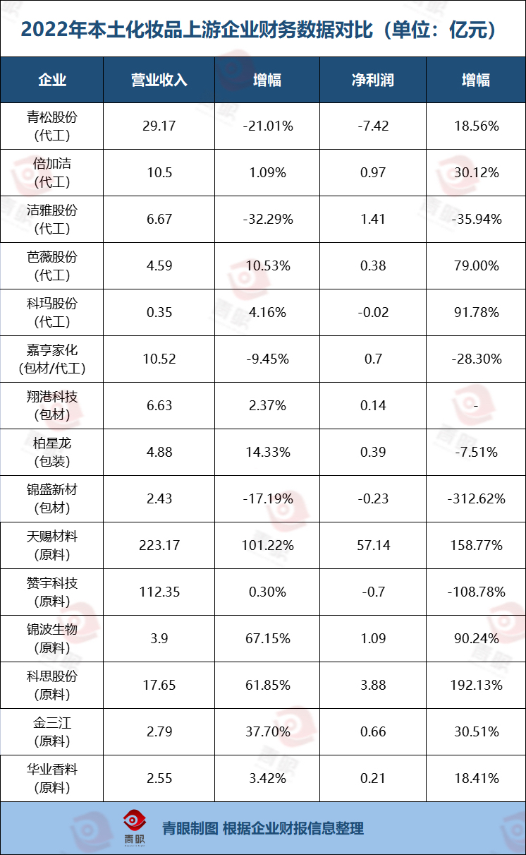 青眼進(jìn)一步梳理15家本土化妝品上游企業(yè)也發(fā)現(xiàn),2022年大多數(shù)代工廠、包材商凈利潤(rùn)、營(yíng)業(yè)收入出現(xiàn)增長(zhǎng)乏力的現(xiàn)象;多家原料商出現(xiàn)高兩位數(shù)增長(zhǎng)。