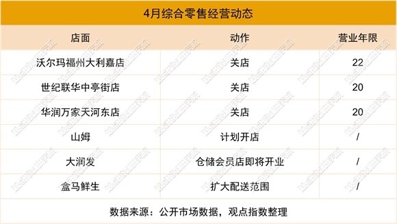 沃爾瑪于4月11日宣布,福州大利嘉店將于18日起停止?fàn)I業(yè)。其于2000年年底開(kāi)業(yè),營(yíng)業(yè)年限已達(dá)22年。無(wú)獨(dú)有偶,4月22日,福州世紀(jì)聯(lián)華商業(yè)有限公司公告,因業(yè)務(wù)調(diào)整需要關(guān)閉世紀(jì)聯(lián)華中亭街店。其開(kāi)業(yè)時(shí)間為2002年年底,經(jīng)營(yíng)年限也已達(dá)20年。同樣的,已營(yíng)業(yè)20年的華潤(rùn)萬(wàn)家天河?xùn)|店將于2023年4月16日結(jié)束營(yíng)業(yè)后,關(guān)閉線(xiàn)上線(xiàn)下業(yè)務(wù),給出的原因是租約到期。