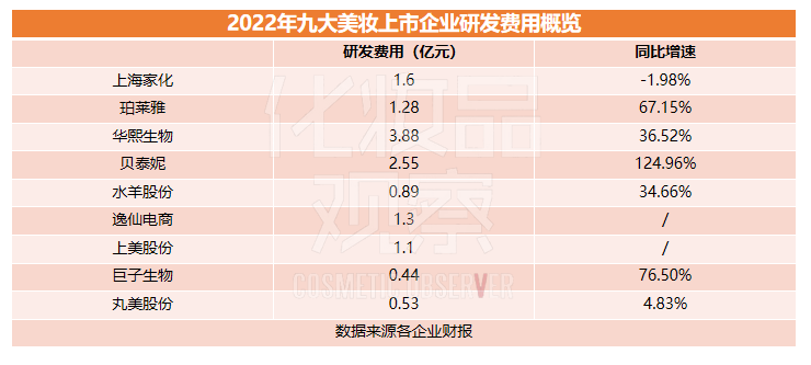 能實現(xiàn)各品牌、各渠道的高歌猛進,靠的是研發(fā)實力。據(jù)化妝品觀察不完全統(tǒng)計,去年,9大企業(yè)(魯商發(fā)展未計算在內)共計投入13.57億元。這9家企業(yè)里面,共有6家美妝上市企業(yè)研發(fā)突破億元。