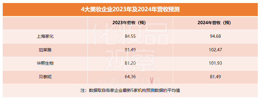 不過,綜合多家機構對上海家化、珀萊雅、華熙生物、貝泰妮等企業(yè)的營收預測(均取最近5家機構對各企業(yè)給出的預測數(shù)據(jù)平均值)可知,今年,上海家化有望穩(wěn)坐營收第一寶座,達到84.55億元。不過,在機構的預測里,華熙生物、珀萊雅今年或均將突破80億;而至明年,這兩家企業(yè)也將紛紛突破百億。貝泰妮和上海家化也將于明年分別突破80億以及90億體量。