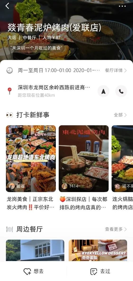 點開POI詳情頁,里面不僅有餐廳的地址、人均消費和營業(yè)信息等基礎(chǔ)功能,還聚合了相關(guān)的筆記內(nèi)容,集中展示人氣菜品、打卡筆記、探店視頻、周邊餐廳等信息。