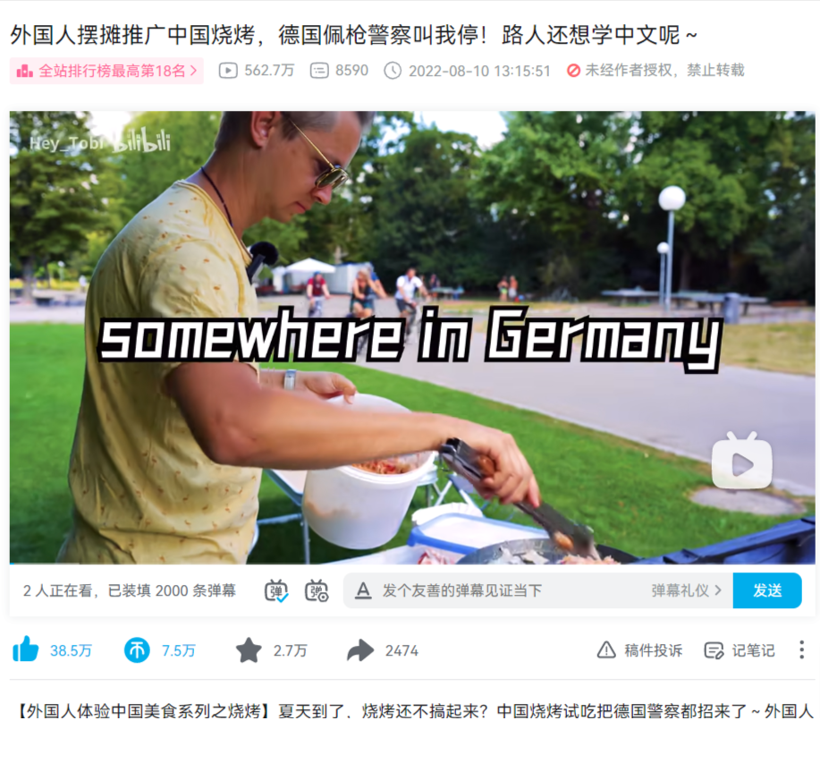 去年8月,B站德國UP主@Hey_Tobi 發(fā)布了一個vlog,講述他帶著中國進口的燒烤設備,在柏林一個公園擺攤,現(xiàn)場做東北酸菜烤肉,并邀請經過的路人吃。大家都發(fā)現(xiàn)非常好吃,表示還想來吃第二次。結果因為太熱鬧,引來警察,考慮到火災隱患,他的燒烤攤只能收檔。最后,這個視頻在B站獲得超過560萬的播放量。