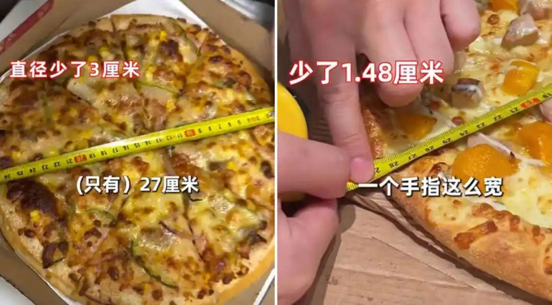 除了上文電子秤的出現(xiàn),盒尺也是打假博主不可少的裝備:在探訪多家比薩品牌時,博主的盒尺下暴露了嚴重短缺的現(xiàn)象。“12寸比薩直徑短缺2cm,9寸比薩短缺4cm,烤盤的尺寸就小一圈。”