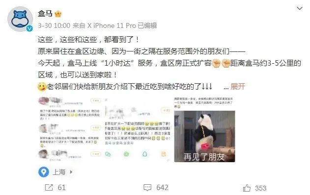 商家們紛紛意識(shí)到了這一點(diǎn)。3月30日,盒馬推出新的概念“盒區(qū)房”,在“3公里30分鐘送達(dá)”的基礎(chǔ)上,新增“5公里1小時(shí)送達(dá)”,服務(wù)配送費(fèi)及免運(yùn)費(fèi)門(mén)檻與3公里內(nèi)保持一致。