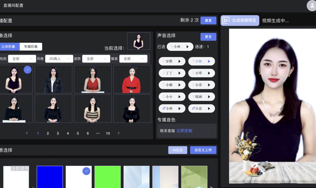 根據(jù)一位個(gè)人賣家提供的公模網(wǎng)址,這里面有上百個(gè)主播形象,用戶可以自由挑選形象、聲音、背景,輸入文本,點(diǎn)擊界面上的一鍵生成,便能看到一個(gè)時(shí)長五分鐘的數(shù)字人視頻預(yù)覽,如果覺得合適,用戶便可以買下公模的使用權(quán),投入到直播間使用。