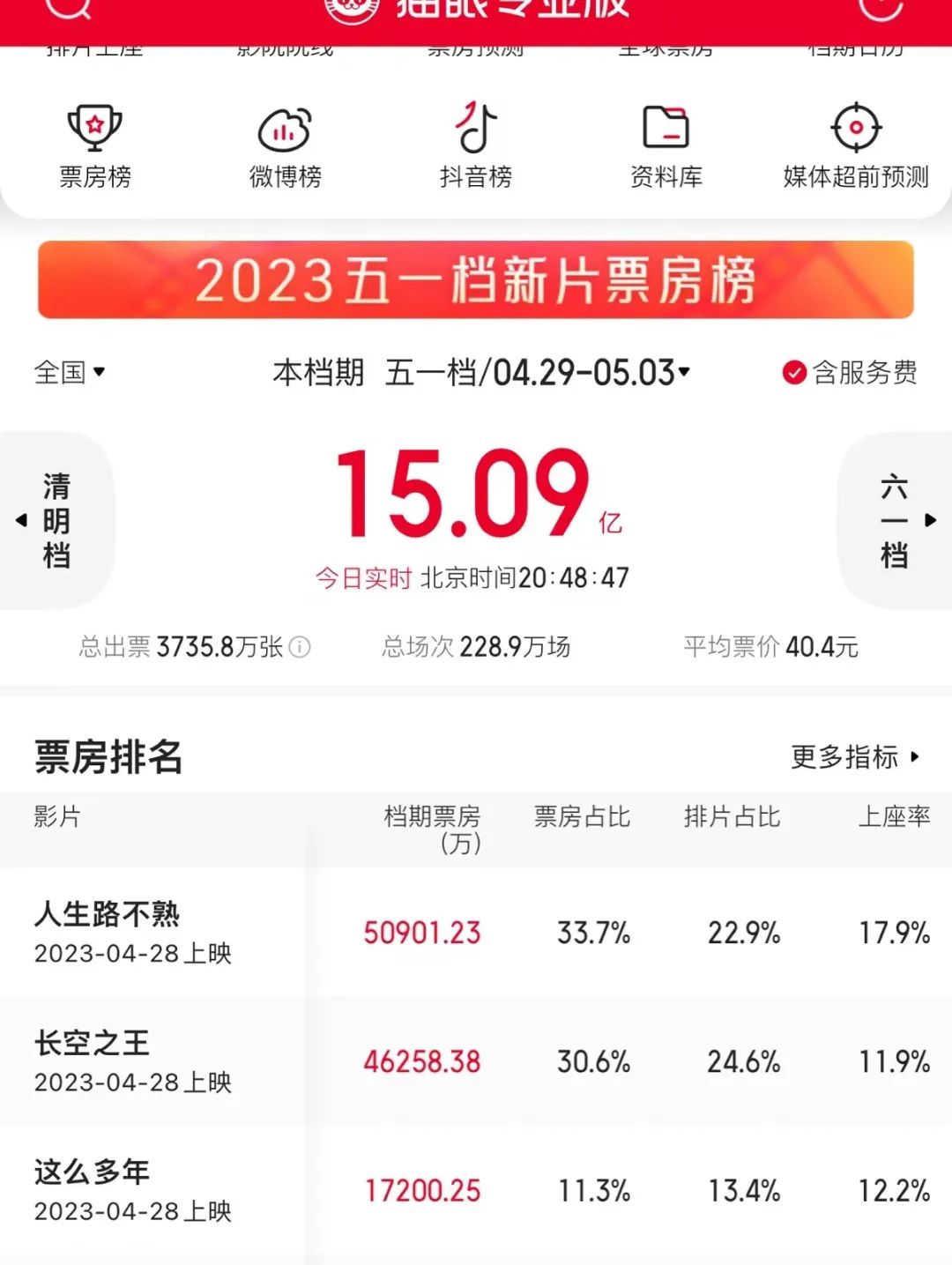 據(jù)貓眼專業(yè)版數(shù)據(jù),截至5月3日21:00,2023年中國電影市場“五一檔”總票房已突破15億元。