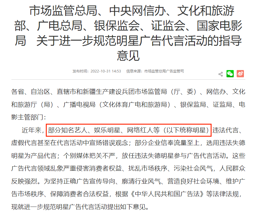 事實(shí)上,類似的規(guī)定早在去年10月的《關(guān)于進(jìn)一步規(guī)范明星廣告代言活動(dòng)的指導(dǎo)意見》(簡稱《意見》)中就有所提及。