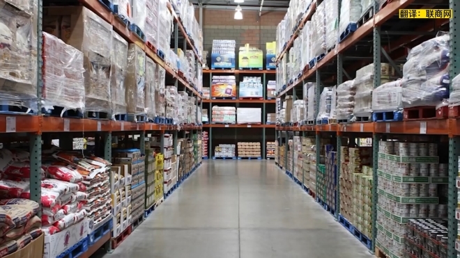 這是開(kāi)市客的照片,到處都是裝著大量食物的盒子,它們一直堆到天花板。你不會(huì)買六塊裝的米脆餅,你只能買54塊裝的大盒,因?yàn)槟闶桥抠?gòu)買,所以那會(huì)是一筆不小的交易。