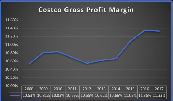 這是另一張圖表,足以說(shuō)明其與眾不同之處,我認(rèn)為這是不言自明的。這是毛利率,這個(gè)指標(biāo)是用以衡量每筆銷售的實(shí)際收益,2017年這一數(shù)據(jù)示為11.33%。這意味著每銷售1美元 他們能賺到0.11美元,當(dāng)你看這張圖表時(shí)11.3%對(duì)他們來(lái)說(shuō)已經(jīng)很高了。