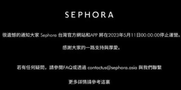 5月4日,路威酩軒(LVMH)旗下零售美妝店絲芙蘭(SEPHORA)宣布,將于5月11日起停止對中國臺灣地區(qū)官方網(wǎng)站及APP的運營。