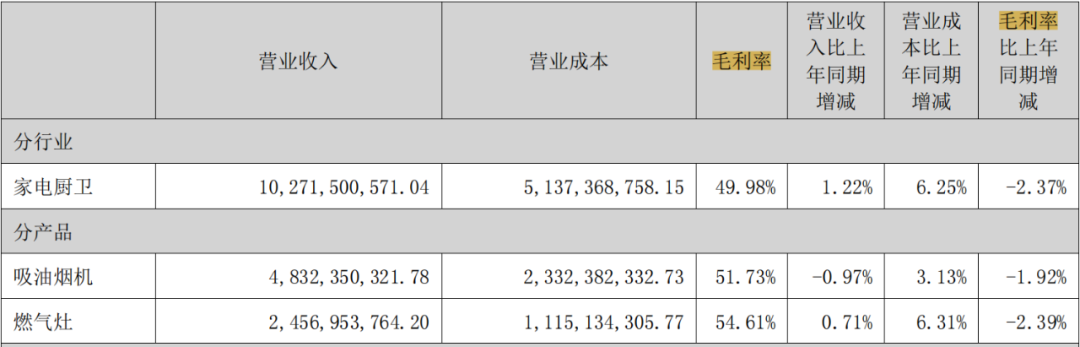 不僅如此,吸油煙機(jī)和燃?xì)庠钸存在著毛利率下滑的情況。根據(jù)財(cái)報(bào),2022年吸油煙機(jī)的毛利率為51.73%,同比下滑1.92個(gè)百分點(diǎn),而燃?xì)庠畹拿蕿?4.61%,同比下滑2.39個(gè)百分點(diǎn)。
