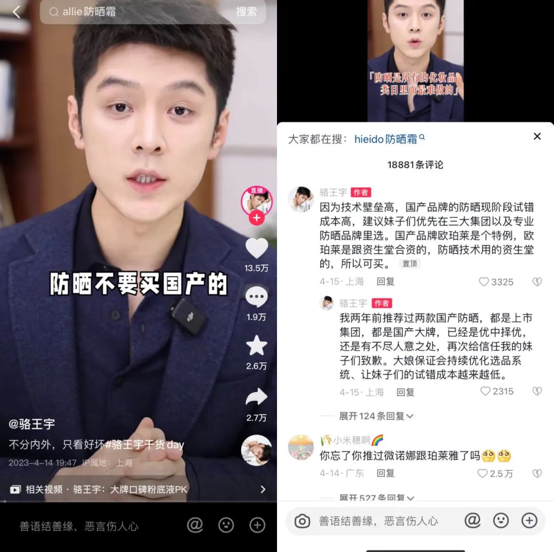 4月14日,抖音千萬粉絲美妝博主駱王宇在短視頻中勸說粉絲不要購買國產防曬,“雖然國貨給的傭金是進口品牌的兩倍,但是這個難聽話我還是得講,不要買國產防曬,至少目前是這樣!