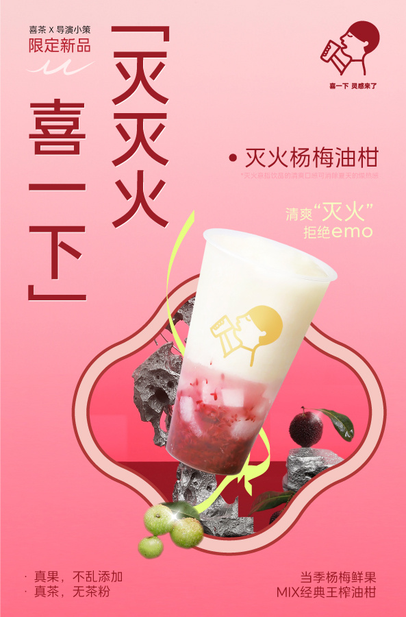 在2021年520的節(jié)點(diǎn),喜茶也以經(jīng)典楊梅系列產(chǎn)品為靈感,聯(lián)合導(dǎo)演小策推出了520限定特調(diào)新品“滅火楊梅油柑”,同時(shí)雙方還推出了發(fā)布《喜一下》短片,通過一對(duì)新人的愛情故事表達(dá)出一杯喜茶傳遞的喜悅,其中喜茶520限定特調(diào)滅火楊梅油柑也在品牌故事片中出現(xiàn),成為男女主愛情的象征,為這款楊梅產(chǎn)品注入激發(fā)喜悅的品牌認(rèn)知。
