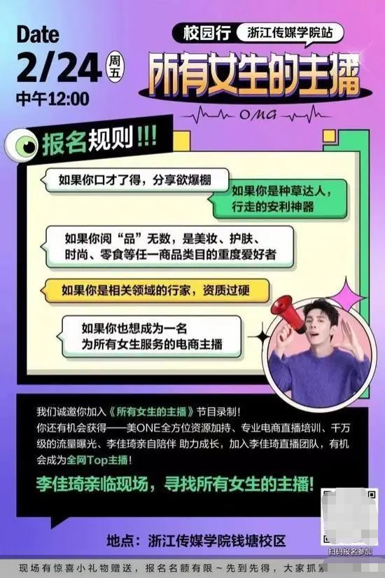 今年2月,美腕再次發(fā)力,推出了一檔名為《所有女生的主播》的綜藝節(jié)目,美腕的CEO和高管們都有出鏡。而這個(gè)綜藝最大的目的便是對(duì)主播進(jìn)行選拔和培訓(xùn)。據(jù)“招募令”顯示,參與節(jié)目錄制就有機(jī)會(huì)獲得美ONE全方位資源加持、千萬(wàn)級(jí)流量曝光、專業(yè)電商直播培訓(xùn),甚至成為全網(wǎng)的TOP主播。