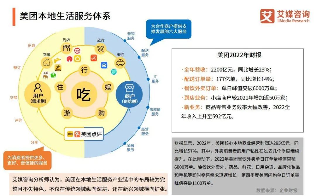 本地生活領(lǐng)域,過去我們常指外賣、團(tuán)購、酒旅。美團(tuán)憑借過去十年的積累,是當(dāng)之無愧的龍頭。據(jù)36氪報(bào)道,2022年美團(tuán)在本地生活到店市場的占有率達(dá)到60%。原因在于美團(tuán)外賣建立了很深的后端履約壁壘,包括騎手?jǐn)?shù)量、配送調(diào)度系統(tǒng)等,這確保了其在滿足即時(shí)性需求上的競爭力。