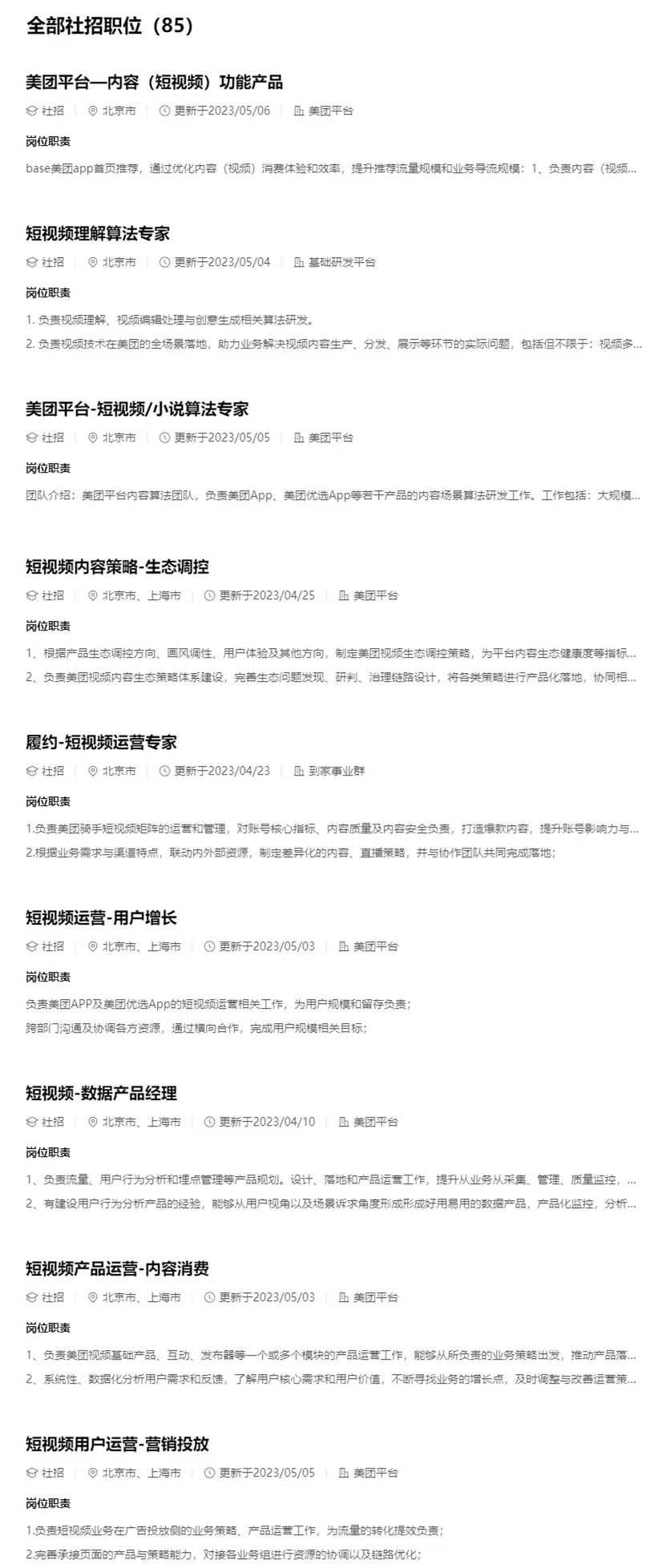 美團(tuán)招聘官網(wǎng)上掛出了多個(gè)短視頻業(yè)務(wù)相關(guān)崗位需求,包括了戰(zhàn)略分析、后端研發(fā)、算法工程、產(chǎn)品運(yùn)營和數(shù)據(jù)分析等不同方向,基本覆蓋短視頻賽道全鏈路。