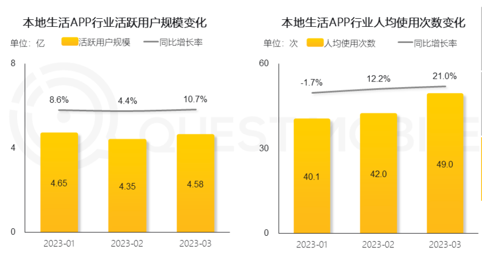 QuestMobile最新數(shù)據(jù)顯示,2023年3月,本地生活行業(yè)迎來復(fù)蘇,在活躍用戶規(guī)模以及使用次數(shù)等方面較2022年同期均有明顯提升。移動互聯(lián)網(wǎng)細(xì)分行業(yè)活躍滲透率中,本地生活已經(jīng)達(dá)到37.9%,僅次于地圖導(dǎo)航、支付結(jié)算和手機(jī)銀行。
