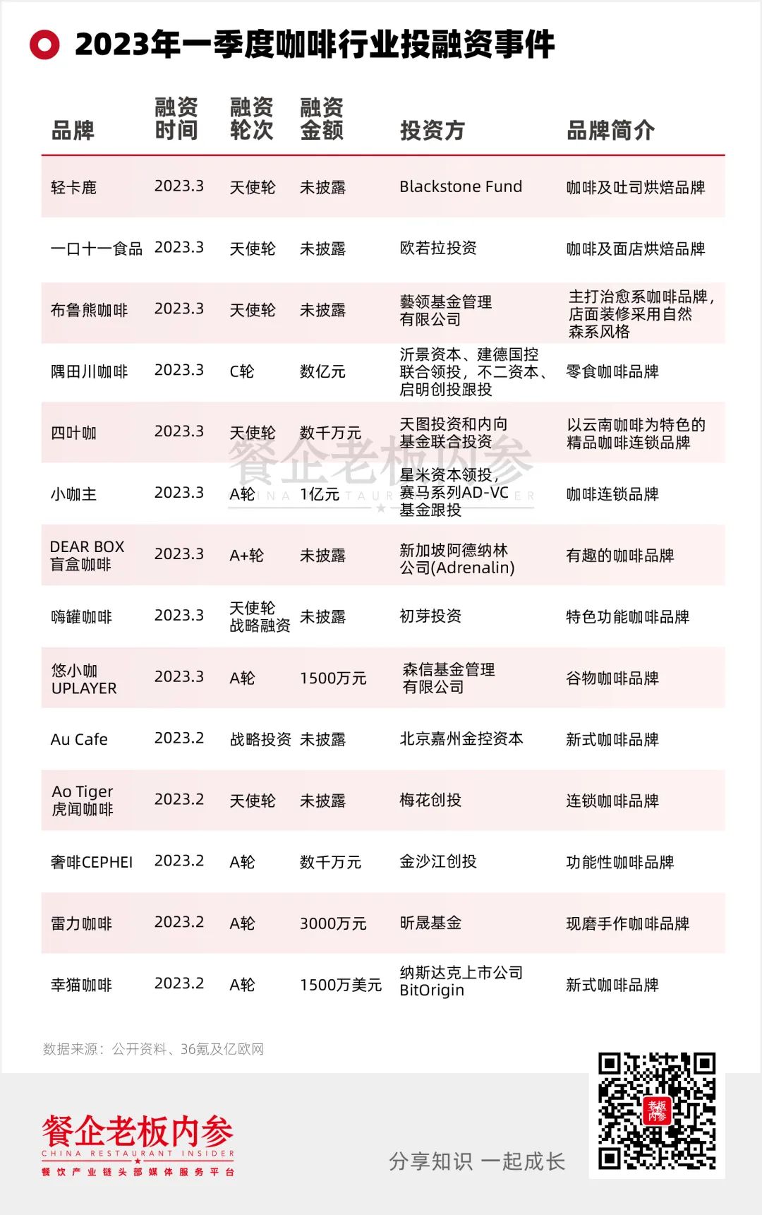 進入2023年第一季度,咖啡再次成為“融資王”,共發(fā)生14起融資事件。有業(yè)內(nèi)人士估算,融資合計金額超過5億元人民幣。