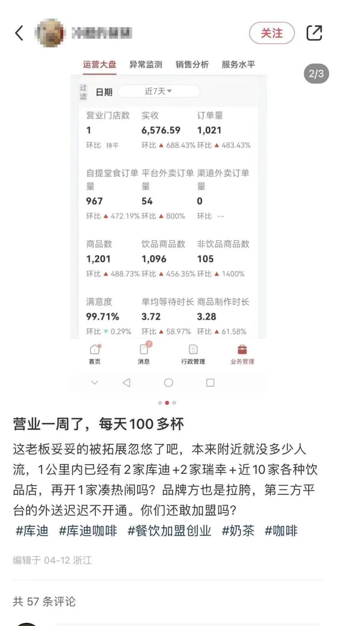 在小紅書、抖音等流量平臺上,關(guān)于“勸退庫迪”的帖子多了起來,有加盟商公布的數(shù)據(jù)顯示4月份的一周其門店訂單量僅為1021,實(shí)收6576.59元,這類帖子引發(fā)了不少加盟商和員工的共鳴,而在幾個(gè)月以前,在流量平臺上搜索庫迪咖啡更多的是眾多加盟商分享開店的喜悅。
