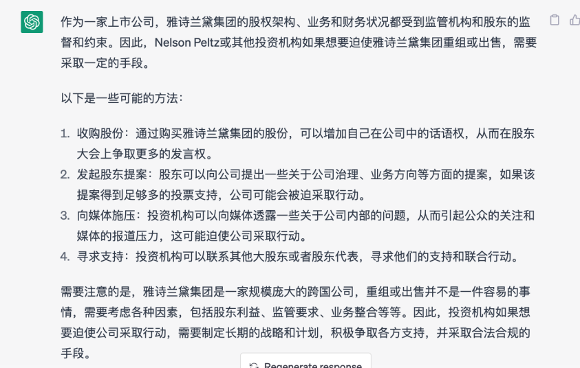 《FBeauty未來(lái)跡》通過(guò)ChatGpt的檢索和整理發(fā)現(xiàn),激進(jìn)投資者要想推動(dòng)雅詩(shī)蘭黛進(jìn)行重大調(diào)整,大致有4種路徑:分別是大量“收購(gòu)股權(quán)”,從而獲得進(jìn)入董事會(huì)的機(jī)會(huì),進(jìn)而推動(dòng)調(diào)整;此外這是發(fā)起股東提案,爭(zhēng)取更多股東的支持,迫使董事會(huì)做出改變;另外則是通過(guò)媒體和輿論施壓;或者聯(lián)合外部投資者和公司股東,進(jìn)行聯(lián)合行動(dòng)。