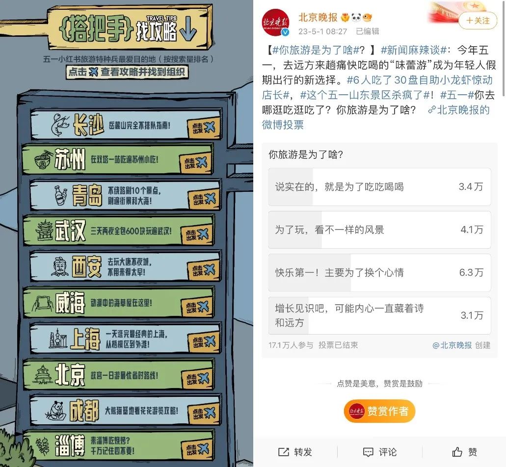 在微博上,“當(dāng)代年輕人特種兵式旅游”相關(guān)話題已經(jīng)有超過7000萬次的閱讀量,衍生話題如“00后特種兵整頓旅游宰客”也已獲得4800多萬次閱讀量。雖不知這股熱潮還將持續(xù)多久,但在當(dāng)下抓住熱點(diǎn)或許才是關(guān)鍵。