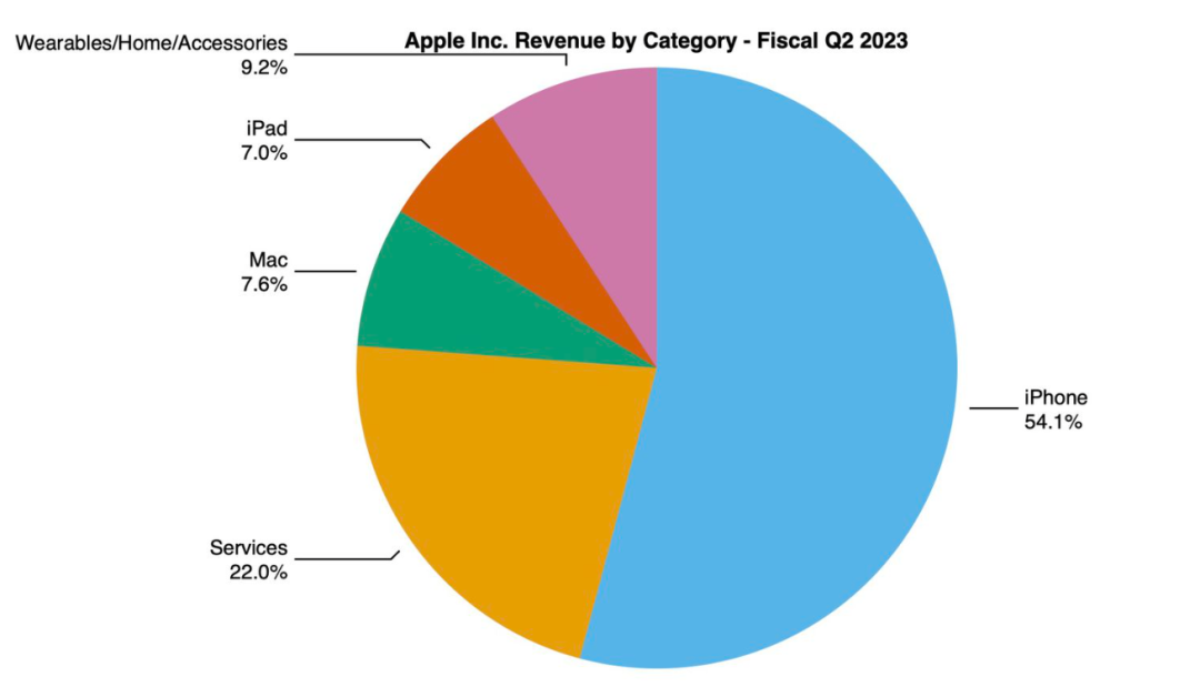 具體品類上,iPhone該季為蘋果貢獻(xiàn)了營收的半壁江山,達(dá)513.3億美元,占比約54.1%,同比增長1.5%;服務(wù)類業(yè)務(wù)是蘋果營收第二大來源,第二財(cái)季營收達(dá)209億美元,同比增長5.5%;Mac類產(chǎn)品營收71.68億,同比下跌31.3%,占比約7.6%;iPad雖仍有不錯(cuò)的銷量,但由于平均售價(jià)較iPhone和Mac更低,其營收規(guī)模已退回至10年前的水平,占比僅7.03%,報(bào)告期內(nèi),該產(chǎn)品營收同比下降12.76%至66.70億美元;此外,可穿戴設(shè)備、家居產(chǎn)品和配件的營收為87.6億美元,高于預(yù)期的84.3億美元,但較去年同期下滑0.6%。