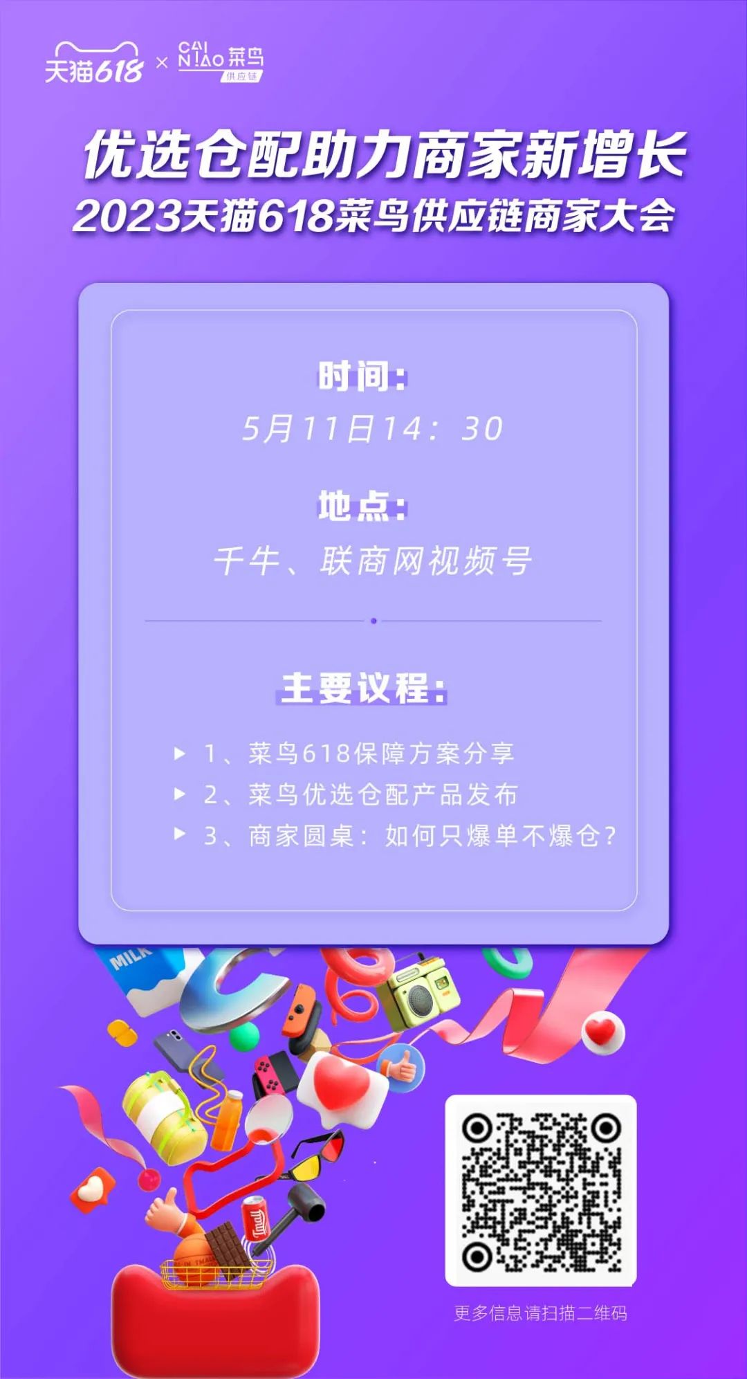 5月11日,以“優(yōu)選倉(cāng)配助力商家新增長(zhǎng)”為主題的2023天貓618菜鳥(niǎo)供應(yīng)鏈商家大會(huì)將召開(kāi),屆時(shí)將為商家?guī)?lái)更多生意增長(zhǎng)新機(jī)會(huì)。