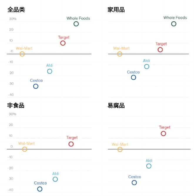以沃爾瑪為基準的商品價格比對。Costco的全品類商品單價比沃爾瑪便宜30%,比Aldi低14%,比全食超市(Whole Foods)低58%。數據來源:JP Morgan
