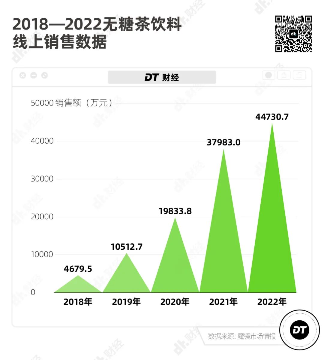 根據(jù)億歐智庫(kù)《2023中國(guó)無(wú)糖茶飲行業(yè)白皮書(shū)》,2018年無(wú)糖茶飲料的線上銷售還只有4679.5萬(wàn)元,到2022年這個(gè)數(shù)字大概翻了10倍。