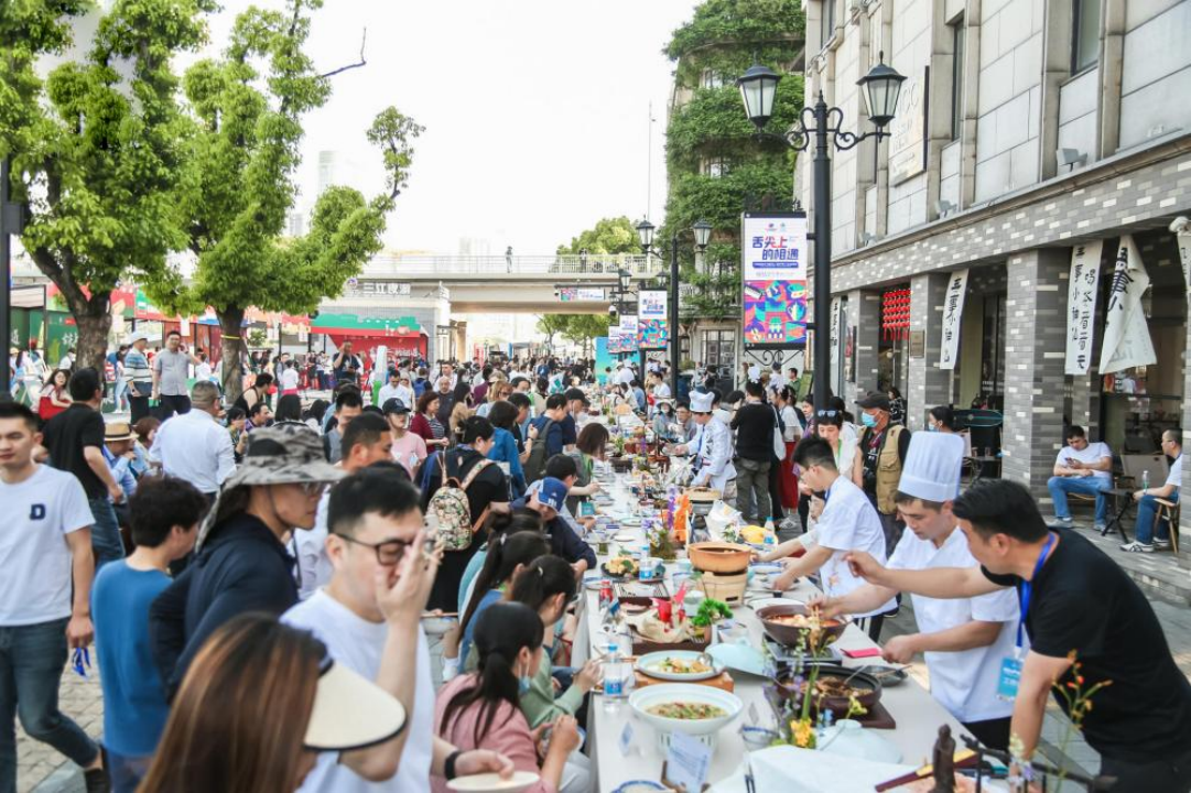 長(zhǎng)桌宴上,弗卡夏火腿三明治、羅馬尼亞烤肉串、溫州黃魚凍、嵊州小籠等中西方美食同臺(tái)爭(zhēng)艷,眾多市民、游客共享美食盛宴,在寧波老外灘呈現(xiàn)出中外美食文化交相輝映的獨(dú)特風(fēng)采。