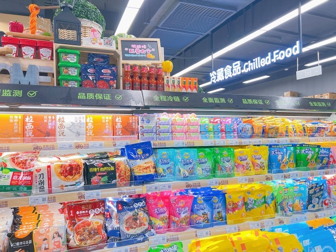 消費(fèi)體驗(yàn):①生鮮服務(wù)可視化:島式布局全程可視化,凸顯商品新鮮、品質(zhì)、安全,滿足顧客“鮮”購物追求 ②熟悉的本地“味道”:本地化的商品集中陳列,親切的本地語言標(biāo)語、80/90年消費(fèi)主力的童年味道 ,給顧客營造了新潮又暖心的購物空間。