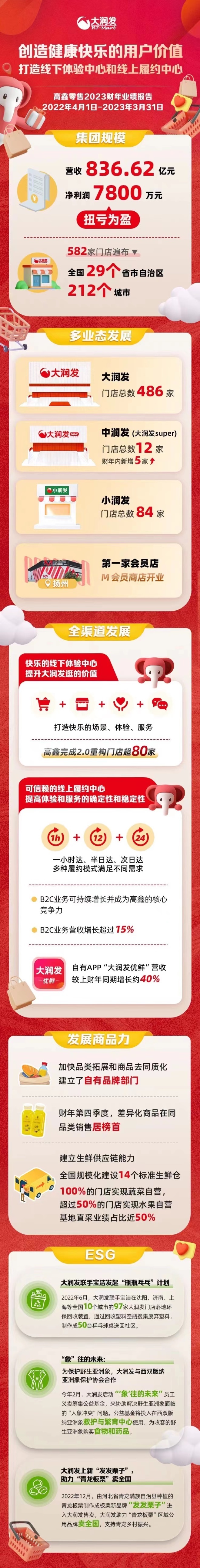 聯(lián)商快訊:5月16日,高鑫零售發(fā)布截至3月31日的2023財年業(yè)績報告,收入達836.62 億元人民幣,營業(yè)利潤11.77億,已覆蓋全國29個省市自治區(qū),在212個城市開出了582家門店。高鑫實現(xiàn)扭虧為盈,凈利潤為7800萬。
