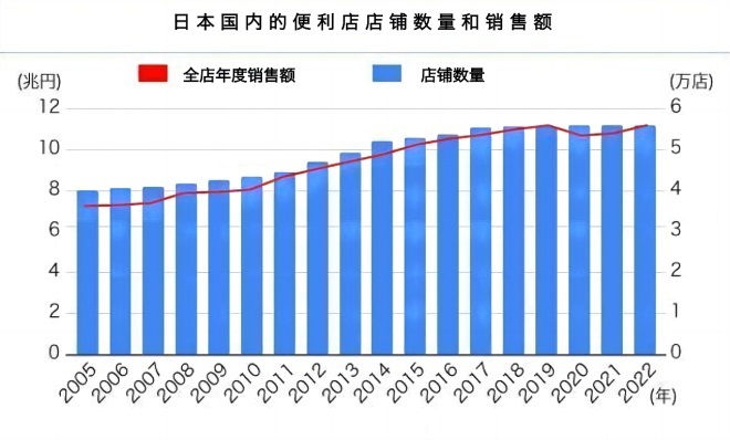 根據(jù)日本連鎖加盟協(xié)會(huì)表示,在公開(kāi)的最古老的統(tǒng)計(jì)數(shù)據(jù)中,截至2005年末,日本全域約有4萬(wàn)家便利店店鋪,行業(yè)銷售額超過(guò)7.2萬(wàn)億日元。最新的2022年末,規(guī)模更進(jìn)一步擴(kuò)大,全國(guó)有超過(guò)5.5萬(wàn)家店鋪,銷售額超過(guò)11萬(wàn)億日元,成為承擔(dān)日本消費(fèi)的巨大產(chǎn)業(yè)。