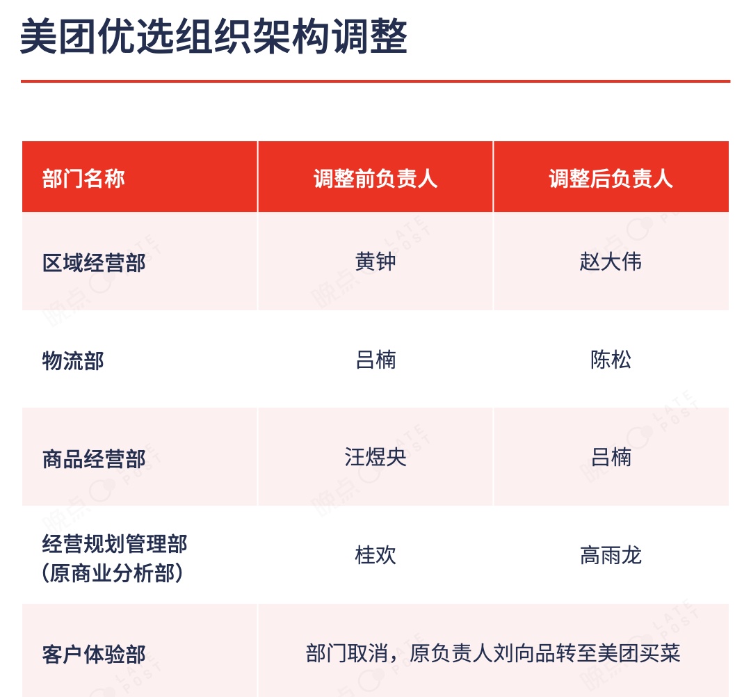 今年4月底,美團優(yōu)選對管理層進行了大調(diào)整,正式取消客戶體驗部。同時,區(qū)域經(jīng)營、物流、商品經(jīng)營、商分的四個與經(jīng)營直接相關(guān)的部門負責人都進行了調(diào)整。