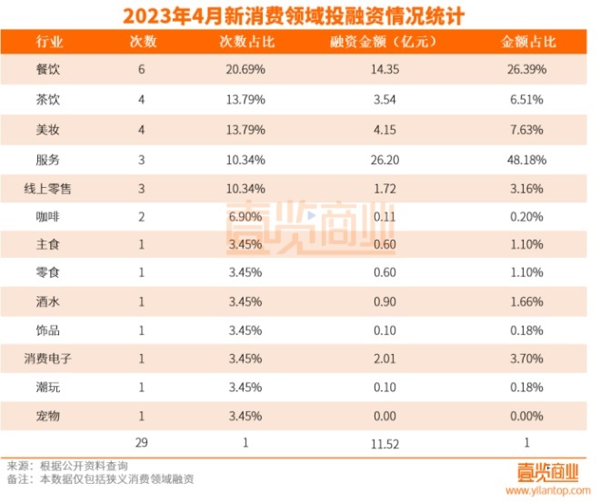 據(jù)壹覽商業(yè)不完全統(tǒng)計,4月新消費領(lǐng)域共發(fā)生29起,融資金額11.52億元。與3月份相比,融資數(shù)量減少21起,環(huán)比減少42%;融資金額減少3.17億元,環(huán)比減少21.58%。