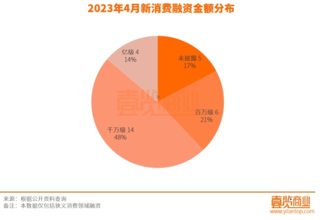 從融資金額來看,除了未披露的5個項目之外,4月份的融資主要集中在千萬級,獲得融資14起,占比48%。另外百萬級融資一共6起,占比21%;億級融資4起,占比14%。獲得億元級別的融資主要分布在吃和用兩個方面。