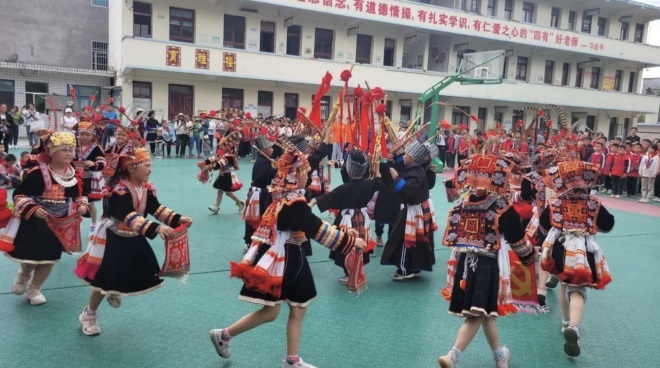 下午2點,“班班有個圖書角”捐贈儀式在優(yōu)美的苗族舞蹈《咕嚕跳月》中拉開序幕。