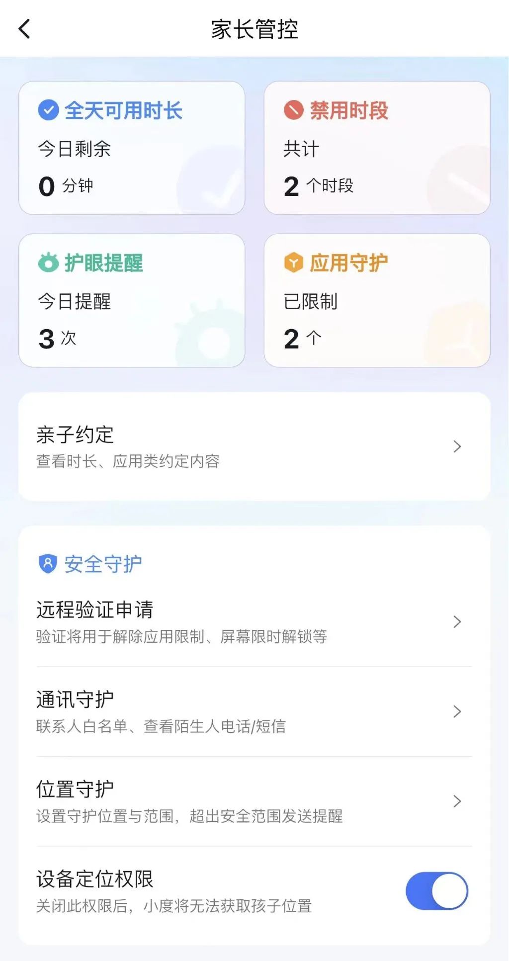 來看其具體的操作:拿到青禾手機后,家長可以在自己的手機中下載小度APP,對孩子手中的青禾手機進行綁定。進入“家長模式”中,家長可以設(shè)置青禾手機的禁用時段、全天可用時長,并對手機應(yīng)用的下載進行限制。
