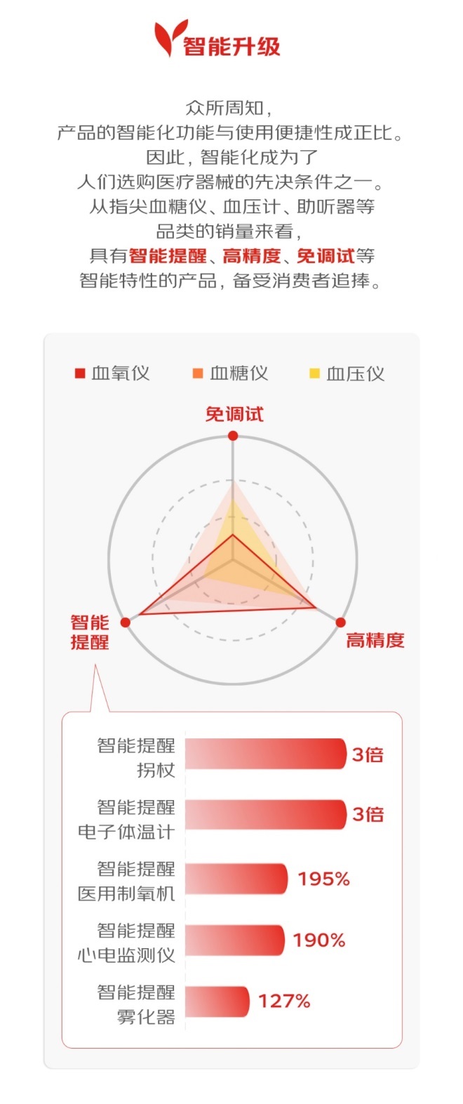 《報(bào)告》表明,目前消費(fèi)者對于醫(yī)療器械的需求逐漸呈現(xiàn)多元化、專業(yè)化、舒適化、便捷化等趨勢。這些趨勢指引著醫(yī)療器械品牌快速迭代升級產(chǎn)品,滿足消費(fèi)者的需求。